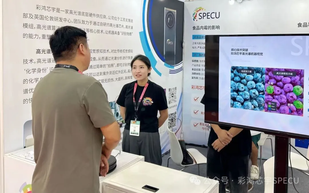 在展会现场,彩鸿芯宇的展位凭借前沿技术与专业呈现,吸引了大量观众驻足咨询。工作人员通过动态演示屏,直观展示了食品在高光谱视觉上的应用案例,讲解从食品原料进入检测环节,到设备快速捕捉光谱信号,再到系统精准识别霉变成分并触发剔除机制,让客户清晰感受到技术优势。